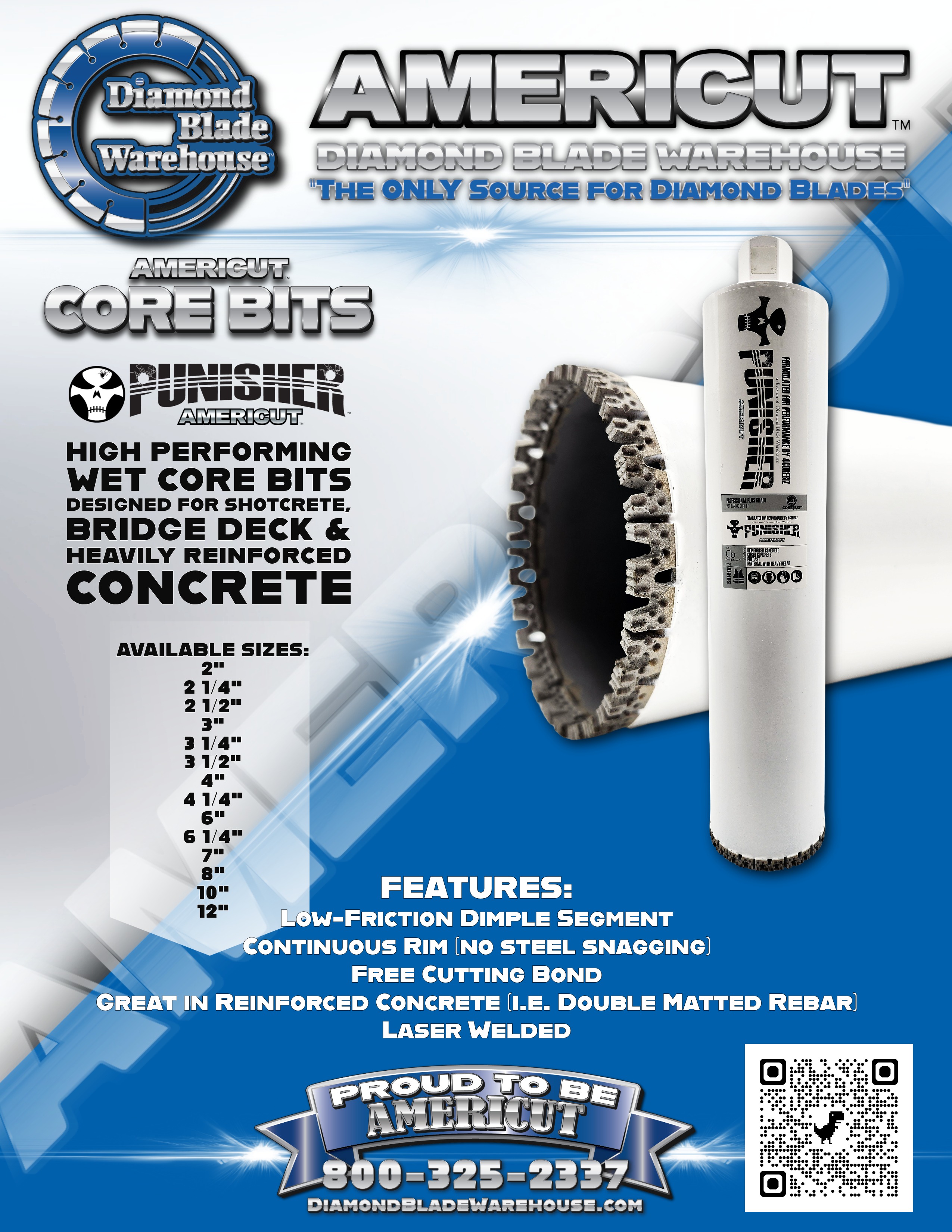 The Punisher is one of, if not the very best core bit, in the business for coring through very heavily reinforced concrete and the most difficult to core items on the Planet. Shotcrete, Bridge Deck, Lift Stations and Nuclear Power plants are among the most difficult to core items around, and the Punisher simply cores right through them! It is designed with a very special “W” segment which is considered to be extremely hard to duplicate effectively among other manufacturers.