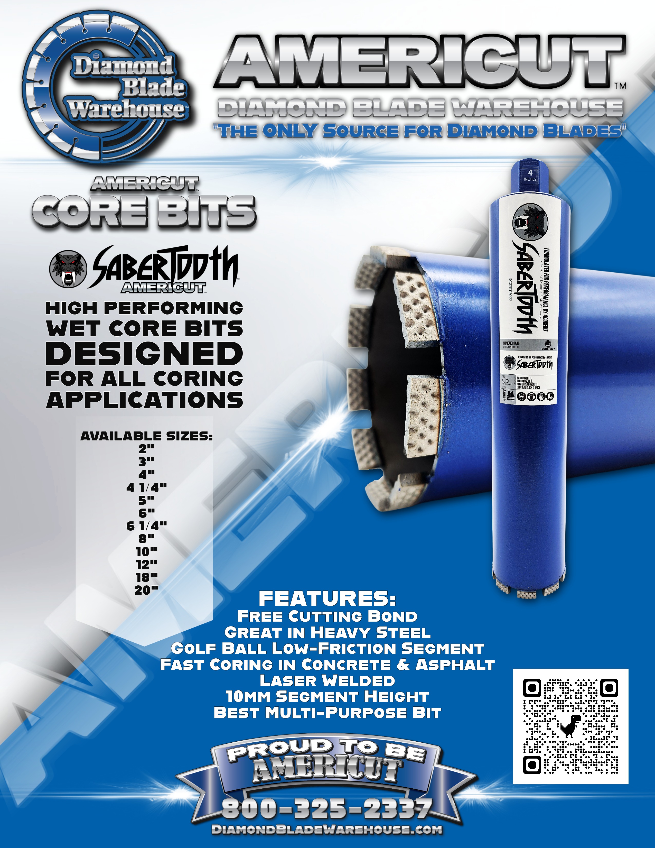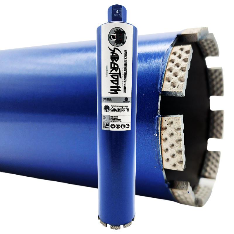 The Saber Tooth core bit is the highest quality core bit ever offered to the construction industry. The specialized segments are the result of many years of research and development to produce a core bit that performs incredibly well in all aggregates and job types. The dimpled segments are made of the top-quality diamonds and contain the largest amount of tungsten and cobalt of any diamond tool. The segment design allows for additional water to remain in the cutting area longer which reduces friction and improves your coring speed and overall life. This core bit is the most expensive core bit made and offered. See for yourself why it is worth every penny!