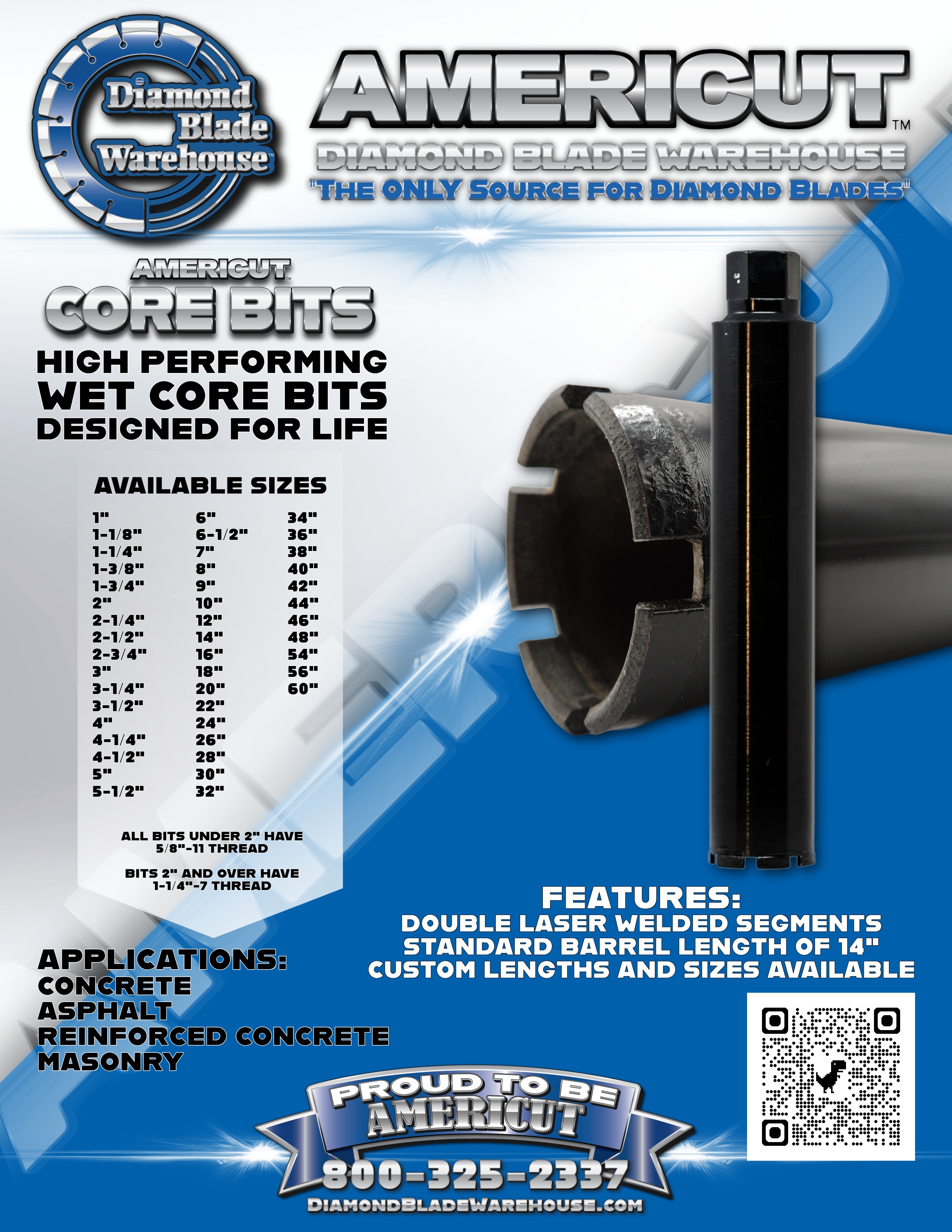 Our V-Shape Segmented Wet Core Bits have a higher diamond count with premium grade diamonds for superior cutting performance and longer product life for wet use applications. These laser welded Wet Core Bits have a shank length of 14 inches, and are 1-1/4"-7 Threaded when over 2" diameter. Otherwise they are 5/8"-11 Threaded under 2" diameter.