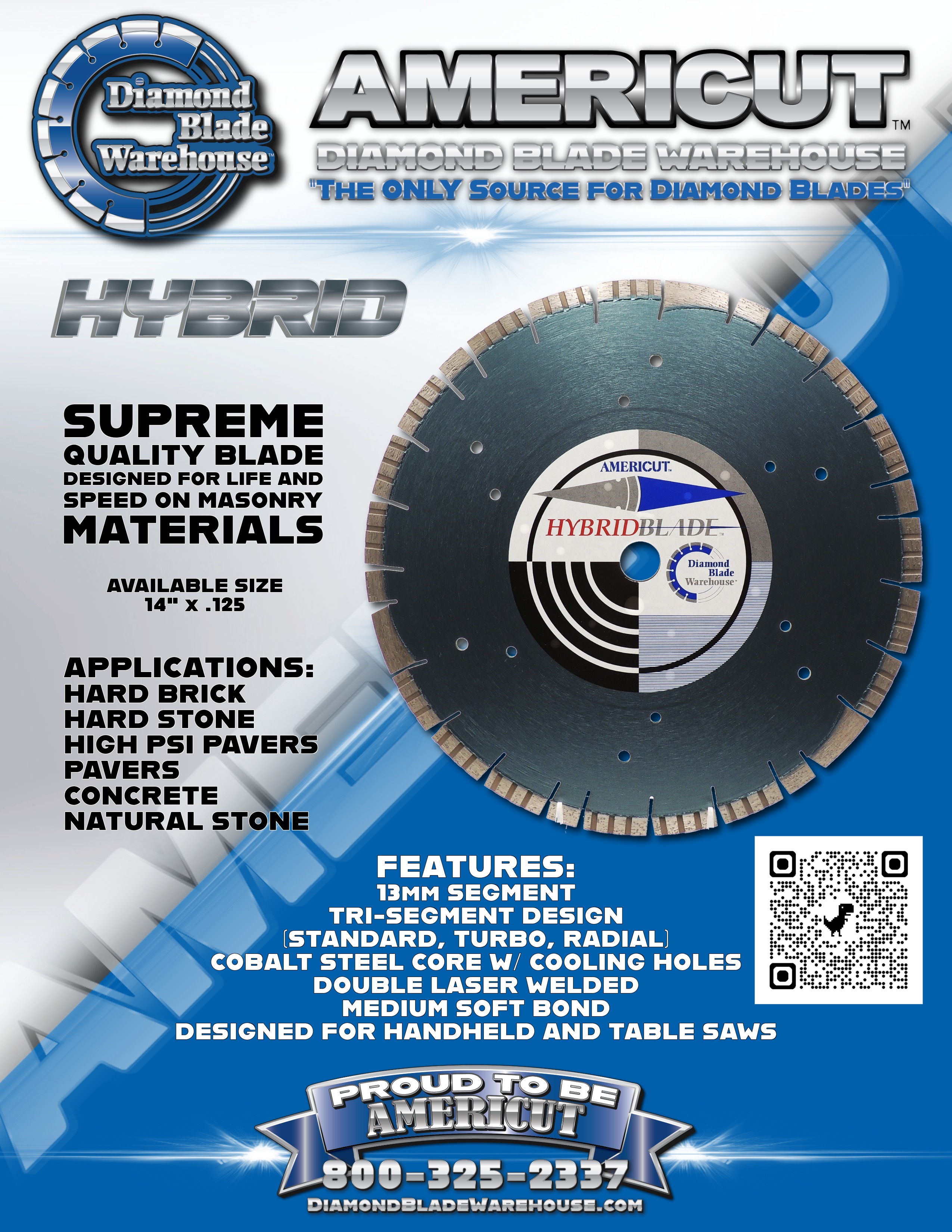 The Americut Hybrid is a Supreme Quality Blade Engineered For Most Masonry Materials. Designed With a Medium Soft Bond, the Hybrid Blade Will Provide a Fast Clean Cut Without Sacrificing Life.